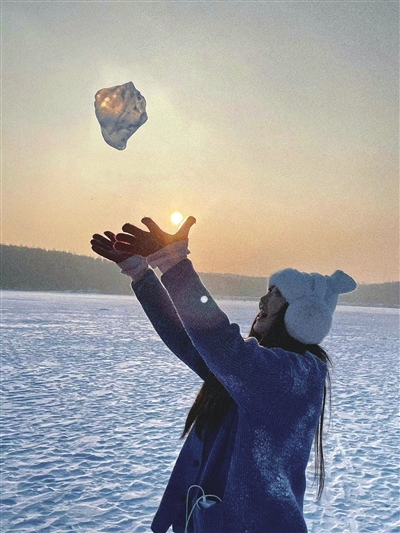 冬天的净月潭太漂亮,我一直在拍照,还在冰面上走了一段路。南方孩子第一次看到这样壮观的冰面,我还弄了冰块放在舌尖尝了尝味道,有一股土地的味道。