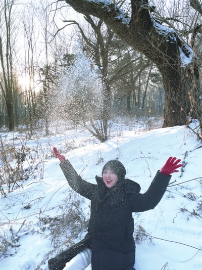 到冰雪游乐场附近,我被林子里的雪吸引了,之前没见过雪,看到雪太兴奋了,我就把手套脱了去抓雪,发现太冻手了,又赶紧戴上手套。