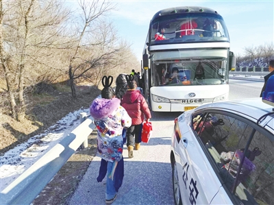 接到转警后民警火速赶往现场。到达后,民警一边引导乘客前往安全区域,一边帮助司机检查安全警示标志的设置情况,并将警车停在大客车后面,拉响警笛进行安全提示。半小时左右客运公司调度的转运车辆到达现场,民警迅速引导滞留乘客有序转运。仅几分钟时间,50余名滞留乘客全部安全换乘转运大客车。车上乘客感谢民警的及时救助,纷纷表达感谢之情。  城市晚报全媒体记者 王跃