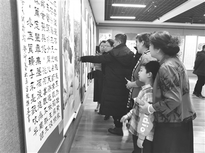 1月16日,白城市洮北区举办“礼赞新时代·丹青颂华年”迎新春书画作品展,有近百件作品参加展览,展期截至1月24日。本次书画作品展旨在喜迎甲辰年的到来,以书画抒发时代之音、讴歌家乡之美。图为市民在白城市文化馆展室内观看书画作品。记者 薄秀芳 摄