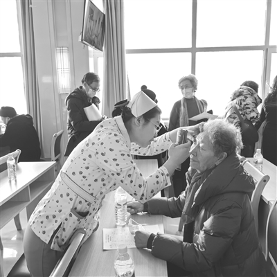 1月24日,由白城中心医院眼科诊疗中心、白城市委老干部局和白城市老年大学联合开展的“关爱老年眼健康·光明伴我行”公益项目在白城中心医院启动。活动现场,眼科诊疗中心的专业团队为白城市老年大学近200名学员进行免费眼科检查,同时还为他们提供了眼健康指导。图为眼压测量。