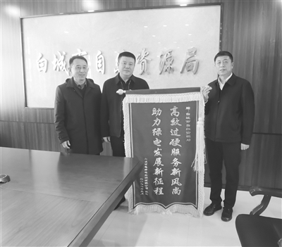 吉电股份白城吉电绿电能源有限公司承建100MW风电项目是白城绿电产业示范园首个电源项目,自提交建设项目用地预审与选址意见书申请表后,白城市自然资源局高度重视、全方位做好便民服务平台,助力白城市经济高质量发展。图为近日,吉电股份白城吉电绿电能源有限公司将一面锦旗送到市自然资源局会议大厅。记者 朱晴 摄