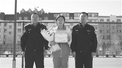 通榆县实验高中学生张秋煜在刚上完晚自习的路上捡到一个钱包(包内有现金还有各种证件和银行卡),随即上交通榆县公安局八区派出所民警,民警通过调取周边监控、核实比对找到失主并将钱包交还。图为近日,派出所民警在通榆县实验高中举行一场特别的颁奖仪式,为张秋煜同学颁发“拾金不昧好少年”荣誉证书。记者 张殿文 摄