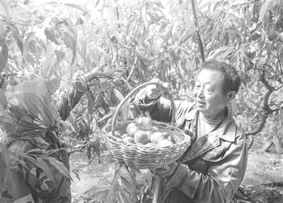 近日,洮南市二龙乡保民村村民李玉国家种植的油桃开园。李玉国凭借多年累积的经验,将油桃栽培得果实饱满、味道清甜,吸引许多游客前去采摘。图为李玉国夫妇在采摘成熟的油桃。邱会宁 范海辉 摄