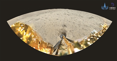 |  | |  |  | 嫦娥六号着陆器全景相机拍摄的影像图。 该图由全景相机在嫦娥六号表取采样前,对着陆点北侧月面拍摄的彩色图像镶嵌制作而成。图像上方是着陆点北部查菲环形山,图像的下方是着陆腿和着陆时冲击挤压隆起的月壤。